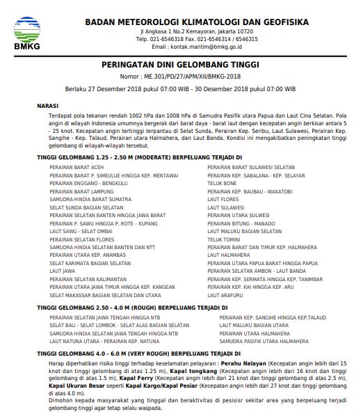 Dilansir TribunStyle.com dari akun Twitter @InfoHumasBMKG, peringatan dini gelombang tinggi di wilayah perairan Indonesia berlaku dari tanggal 27 Desember 2018 hingga 30 Desember 2018.